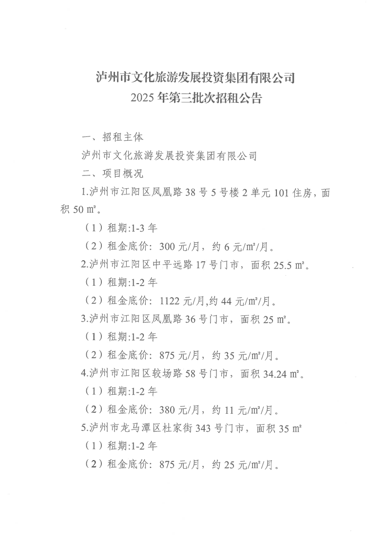 瀘州市文化旅游發(fā)展投資集團(tuán)有限公司2025年第三批次招租公告