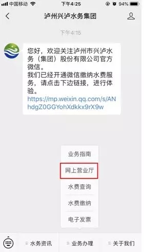 用戶可通過關注“瀘州興瀘水務集團”公眾微信號,選擇業(yè)務辦理-網(wǎng)上營業(yè)廳或登錄“瀘州市政務服務和非公經(jīng)濟發(fā)展局網(wǎng)站網(wǎng)上大廳”辦理用水相關業(yè)務,真正體驗用水業(yè)務從“腿上辦”到"掌上辦"的轉(zhuǎn)變。